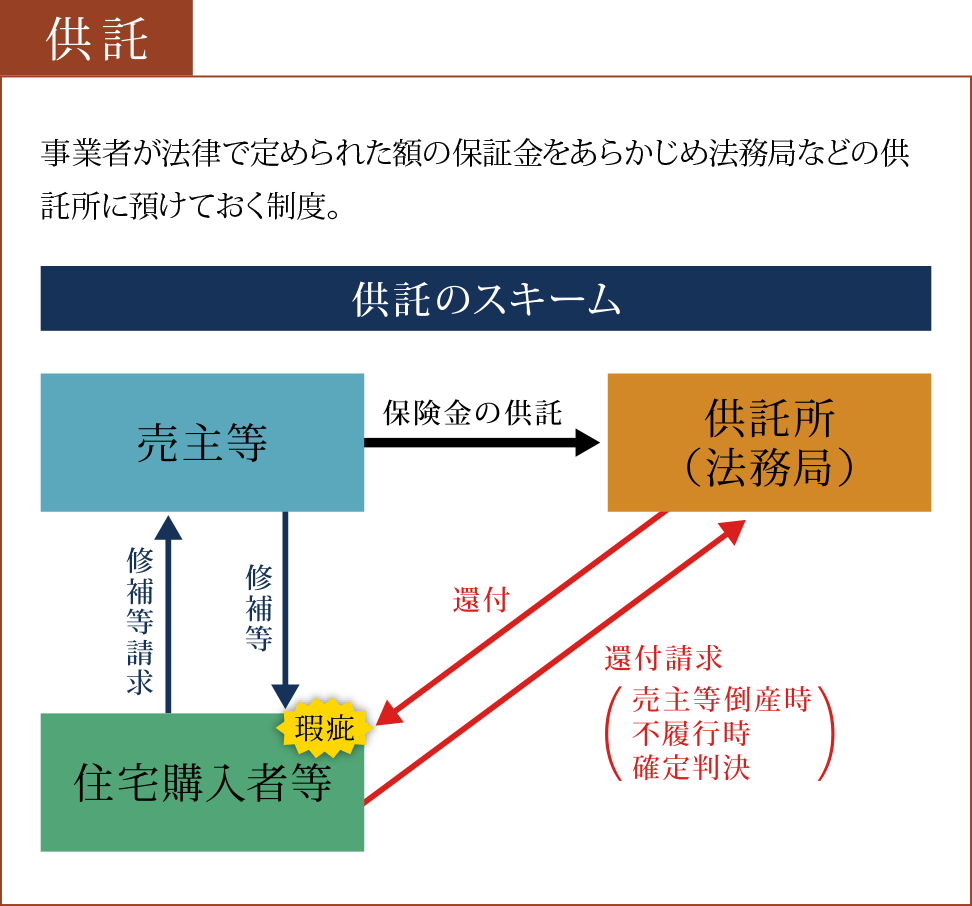 住宅の構造耐力上主要な部分および雨水の侵入を防止する部分の瑕疵に起因して、住宅の基本的な耐力性能あるいは防水機能を満たさないことによる損害があった場合でも瑕疵担保履行法に基づき、お客様の利益保護のための修繕費などの資力確保を目的として、「保険」もしくは「供託」のいずれかの措置を講じています。