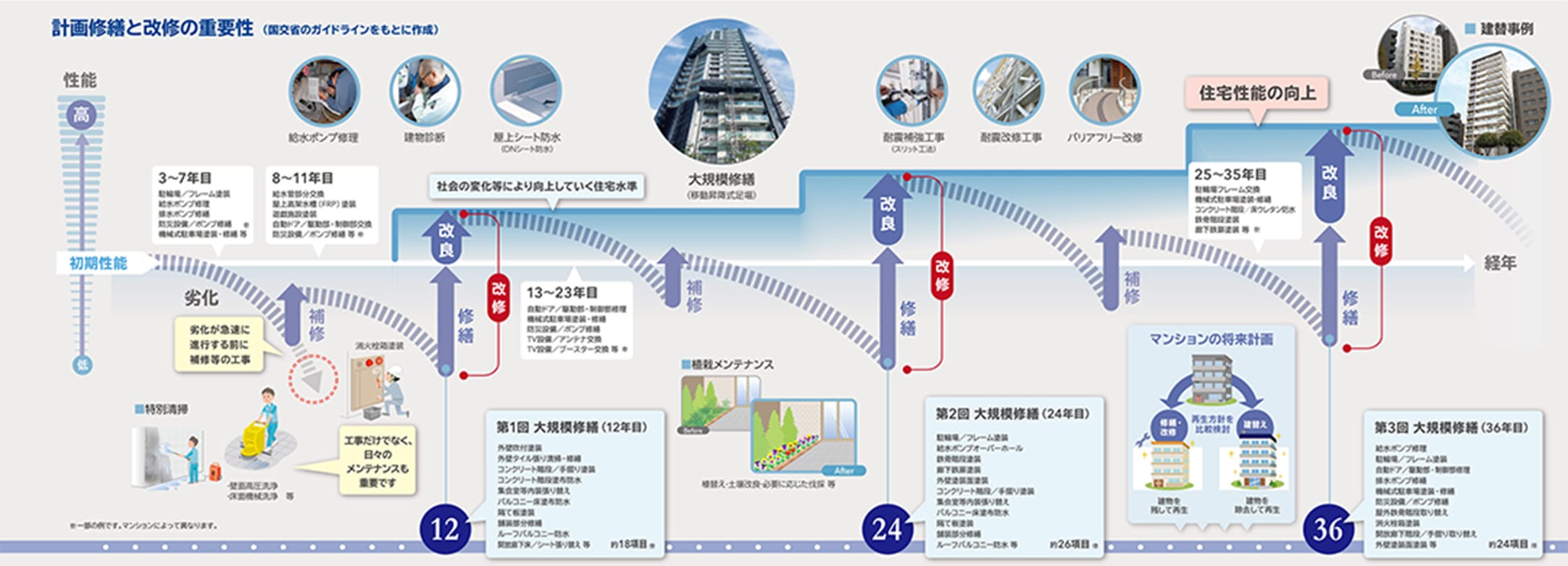 どのような住宅も、時の経過とともに傷みや不具合が生じてしまいます。そこで必要となるのが、定期的な調査診断や修繕工事です。長谷工不動産では将来の住み心地を見据えて、修繕項目、修繕時期、修繕費用などについての修繕計画と修繕積立金の額などについてまとめた長期修繕計画案を管理組合様へご提案しています。