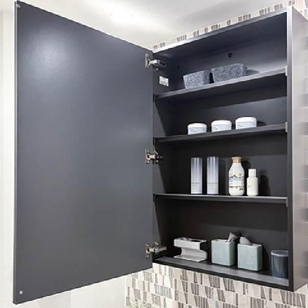 化粧品など洗面室で使う小物を鏡の裏に収納できます。