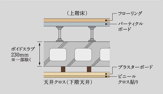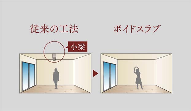 小梁が室内に出ないボイドスラブを採用しています。天井部分の小梁の出っ張りをなくし、伸びやかで開放的な室内空間となります。(一部除く)