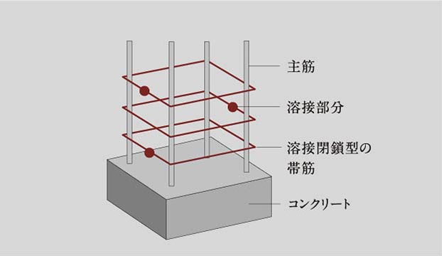 柱の帯筋には溶接閉鎖型の帯筋を採用しています。帯筋のつなぎ目を工場溶接したもので、現場で施工するフック加工の帯筋に比べ、地震時の柱の崩壊に対して効果を発揮します。(一部除く)