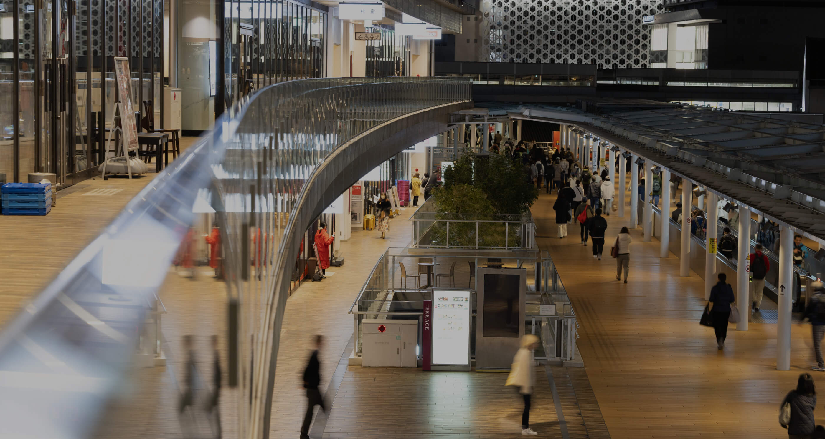 相鉄・小田急とJRの間に歩行者デッキで結ばれる駅間エリアが存在。