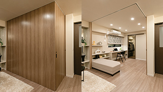 リビングと洋室の間をフレキシブルに可変できるウォールドアを採用。開放すれば広々リビングに、閉めれば在宅ワークの個室としても利用できます。