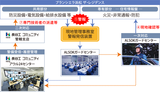 住戸内・共用部の異常を迅速に感知し長谷工コミュニティのアウル24センターに自動通報。状況に応じて提携警備会社が駆けつけ、関係各署への通報など一次対応を行い、二次対応では管理会社からスタッフが駆けつけるなど、24時間365日暮らしを見守ります。