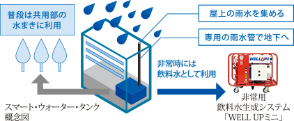 「スマート・ウォーター・タンク」は、水道水に加えて貯水した雨水を緑地灌水に有効利用することで節水・水道料金の低減を図ることができます。また、災害による断水時には非常用飲料水生成装置「WELL UPミニ」を利用することで、飲料水を供給することができます。