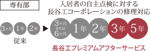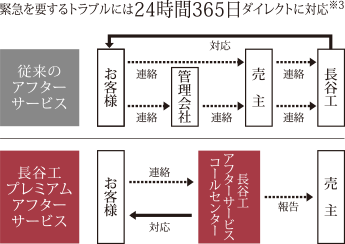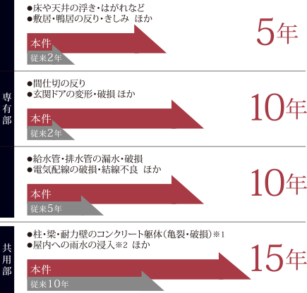 ※1)構造耐力上影響のあるもの(鉄筋のさび汁を伴った亀裂・破損及びこれに準じるものとし、毛細亀裂及び軽微な破損は除く)に限ります。※2)おおむね10年目に適切なメンテナンス(トップコート〔塗布防水・アスファルト防水〕塗布、シーリング補修、アスファルトルーフィング〔浮き・剥れ〕の補修、コーチングの打ち替え〔アスファルト防水〕、端部シールの打ち替え〔DN防水〕等)を行うことを条件に、期間を15年とします。※3)夜間や土・日・祝日・年末年始等の会社休業日は、アウル24センターにて受付いたします。※保証期間の詳細については係員等にお尋ねください。