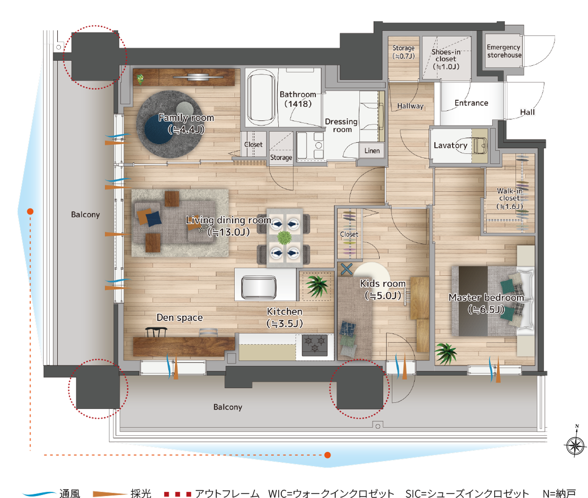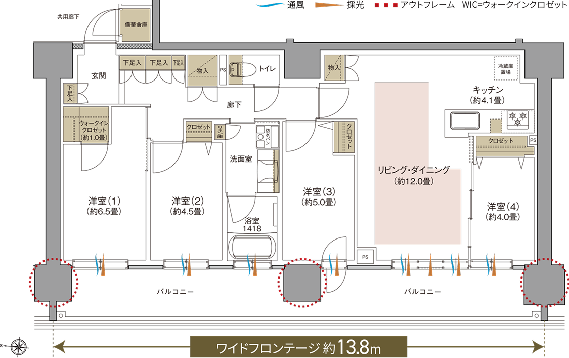 リビングとすべての居室を西側開口部に配置することで通風、採光性に優れたワイドフロンテージを実現した4LDKプラン。約13.8mもの間口が開放感を、面積22㎡超のバルコニーがさらなるゆとりを創り出します。
