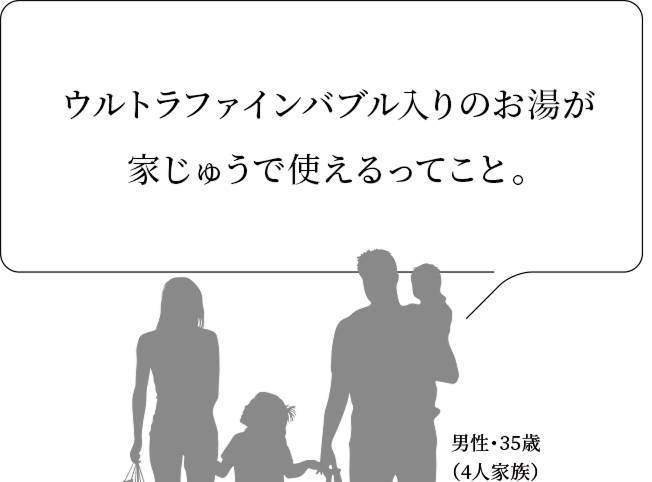 「ウルトラファインバブル」入りのお湯が、家族のお肌の潤いを保ち、浴室やキッチン、洗面所などの水廻り設備の汚れを防いで掃除の負担を軽減します。