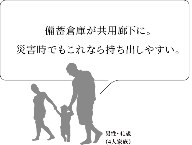 また、備蓄倉庫は共用廊下に設けることで、防災品を居住空間外に収納しておくことができます。