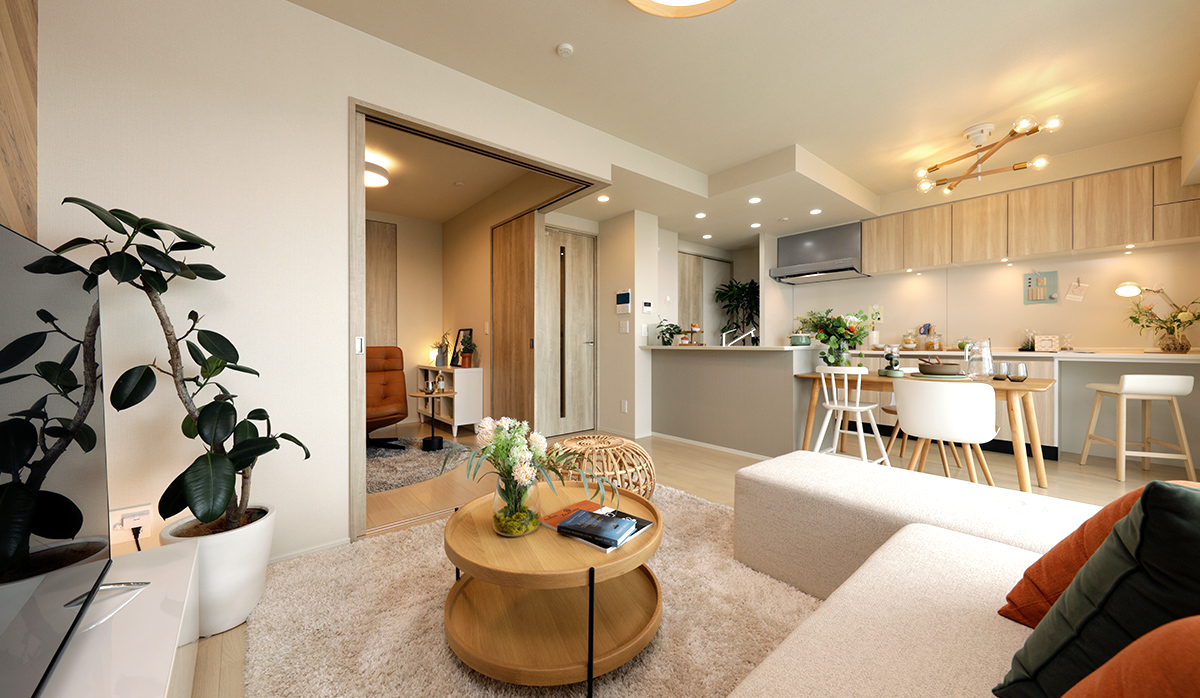 - スライドドアを開けて洋室(2)とリビングを一体的に活用