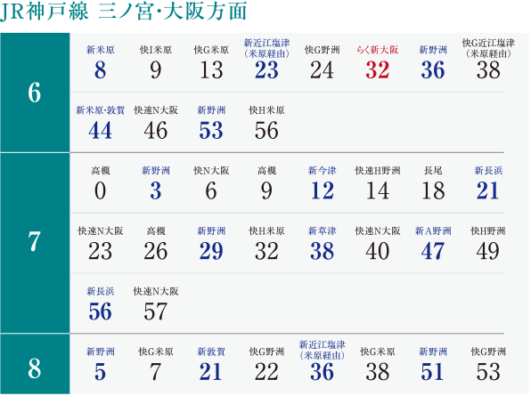 黒=普通、快速 青=新快速 新=新快速 新A=新快速(9号車 Aシート連結・乗車整理券500円または指定席券が必要) 快C・快G・快H・快I・快N=快速 らく=通勤特急らくラクはりま(全車指定席) <行先> 今津=近江今津 赤穂=播州赤穂