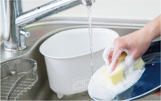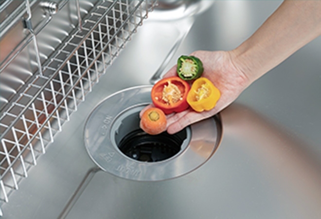お料理の際に出る生ゴミをスイッチひとつで粉砕処理。生ゴミを無くしゴミ出しの手間を軽減します。粉砕された生ごみは排水処理槽で浄化してから排水します。