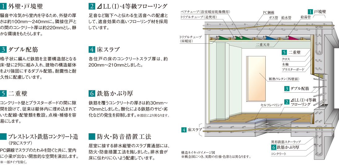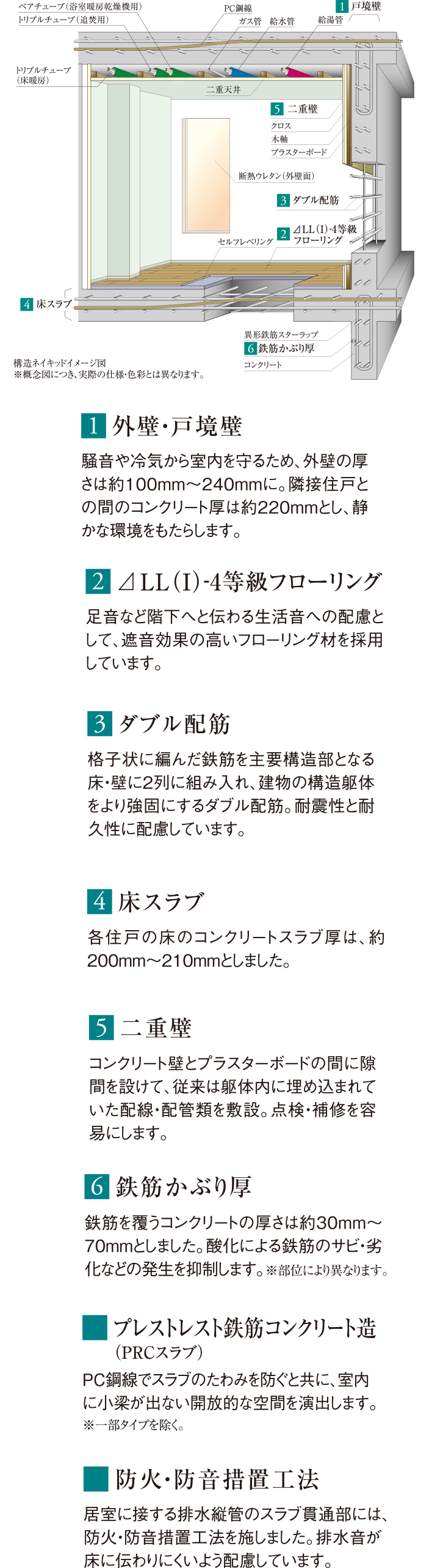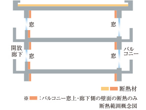 最上階住戸への配慮として、屋上には外部側へ断熱材を敷設。また断熱材は外壁側から天井スラブ下までカバーし、外部の冷気を伝わりにくくしています。