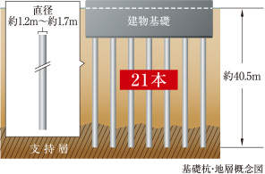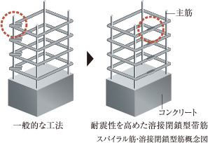 建物の耐震性への配慮として、柱の外周帯筋はスパイラル筋または溶接閉鎖型筋を採用しました。地震時の曲げ力やせん断力に粘り強さを発揮します。※一部除く。