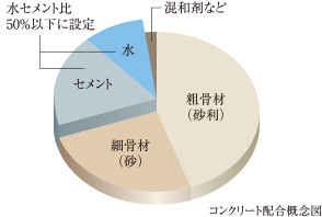コンクリートの強度を左右する、セメントに対する水の比率を50%以下に抑制。中性化による劣化を抑えて、高い強度をもたらします。※一部除く。