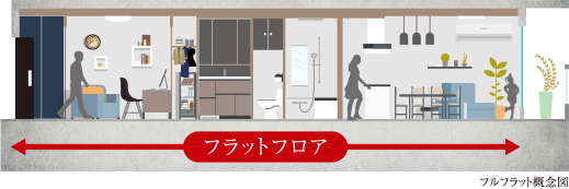 住戸内でのつまずきなどの事故を抑制するため、フルフラット設計を採用しました。