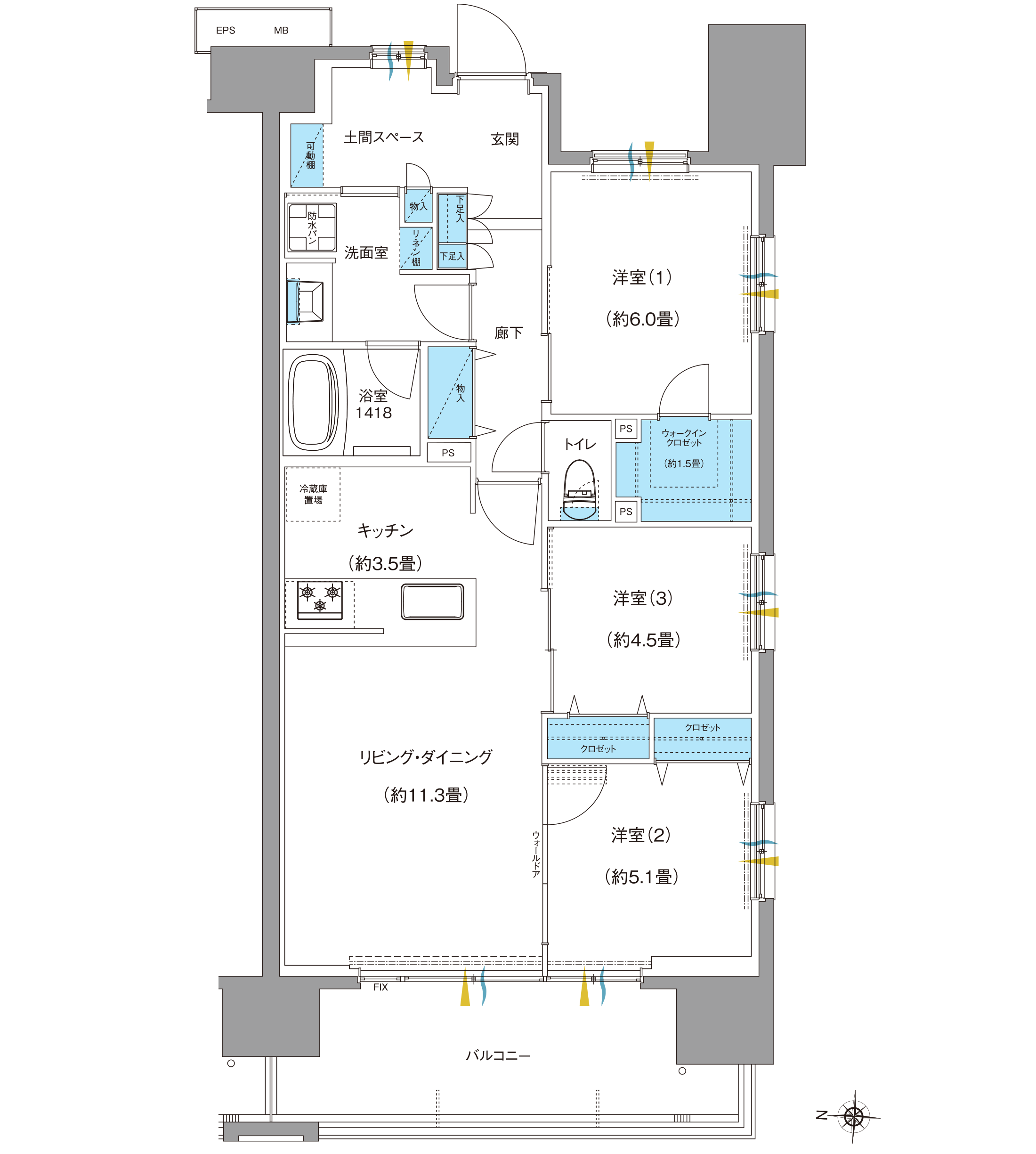 ■広々としたウォークインクロゼットや廊下の物入など、収納が豊富な3LDK+WICタイプ。