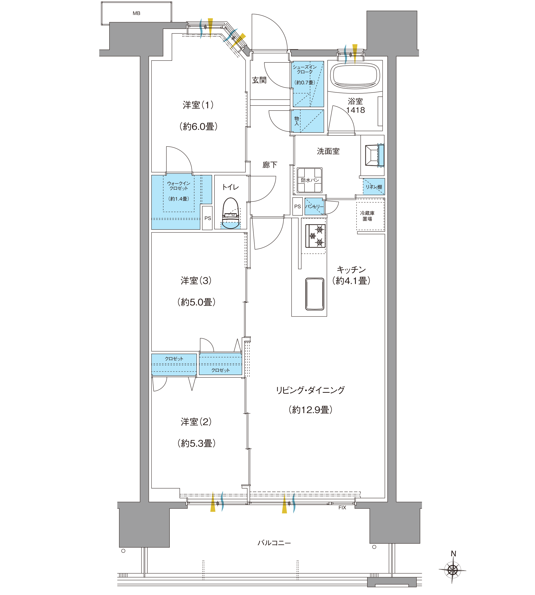 ■各洋室を5畳以上確保したゆとりある3LDK。