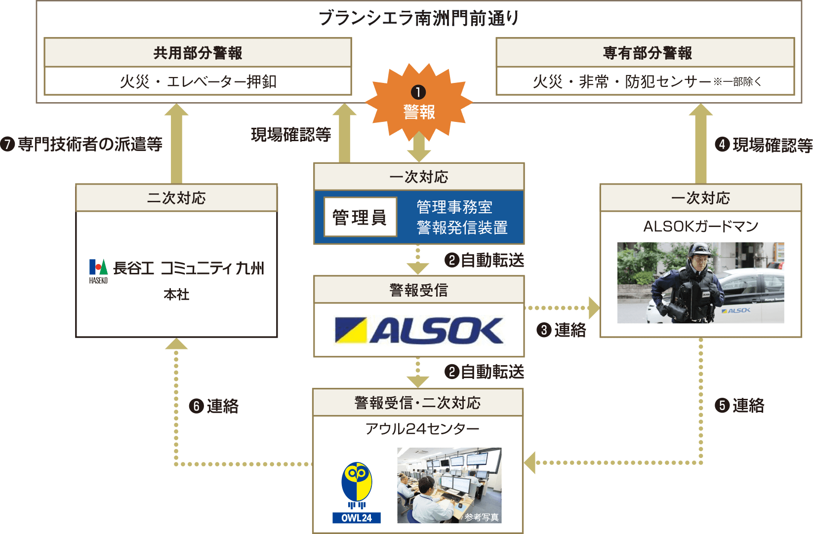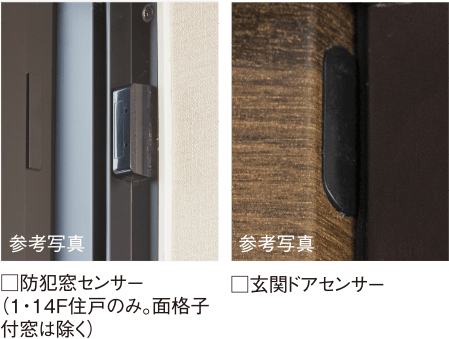 防犯センサーを玄関ドアと一部窓に設置しています。設定時にこれらが開けられると、センサーが反応し、住戸内の情報盤が警報を発報、管理事務室を経由して警備会社へ通報されます。