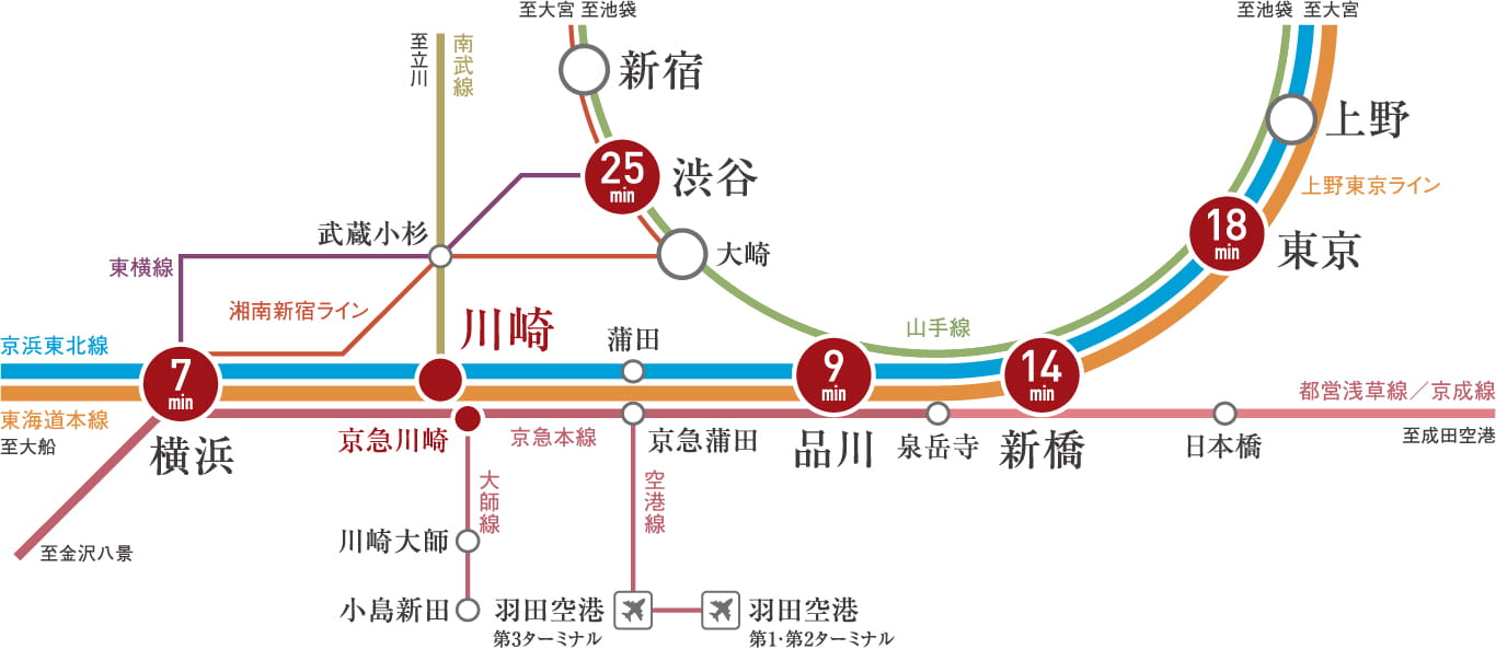 「東京」駅へ直通18分、「横浜」駅へ直通7分。