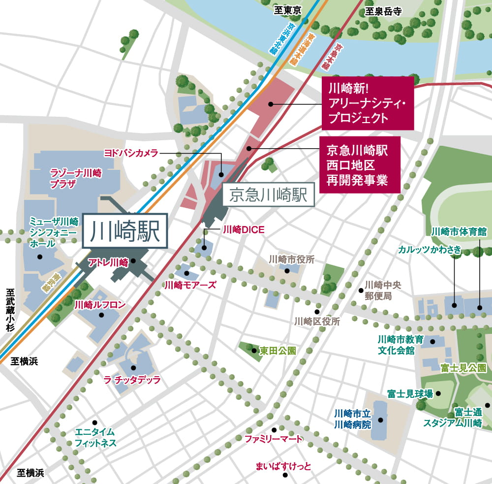 都心、横浜への好アクセスに加え、羽田空港や「品川」駅にも近く、首都の拠点都市として進化を重ねる「川崎」。京急「川崎」駅に隣接する地ではスポーツなど様々なイベントが開催できるアリーナを中心とした新しい街づくりが進行中です。