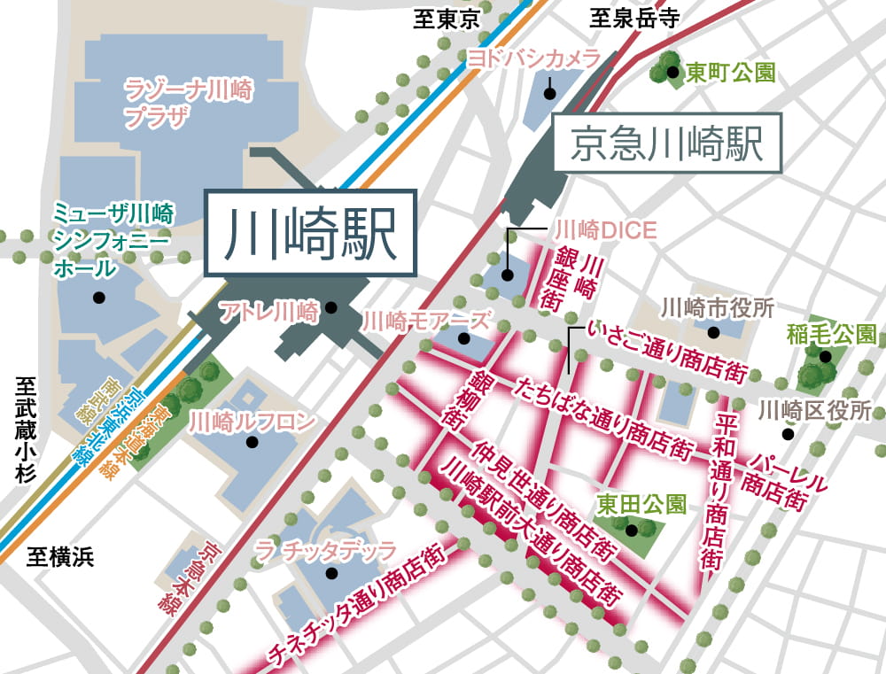「川崎」駅前には、150以上のお店が立ち並ぶ「川崎駅前仲見世通商店街」や、ステンドグラスのアーケードが有名な「銀柳街」など、大型商業施設の間を縫うように多くの商店街が広がります。ショッピングはもちろん、食べ歩きやイベントなど、さまざまな魅力を実感いただけます。