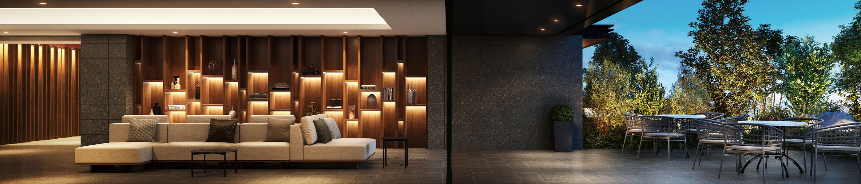 素材そのものが醸し出す木目の趣と変化のある造形を融合させ、デザインコンセプトの“ゆらぎ”を表現しています。さらに四季折々の中庭の景色を眺めることができ、光や風、緑のゆらぎも、ゲストや住まう方同士のふれあいをエスコート。天気がいい日に屋外ラウンジで過ごすと、リゾートホテルのような安らぎを感じることでしょう。ガラスの意匠で内外を一体化し、心解き放つ時間をお届けします。