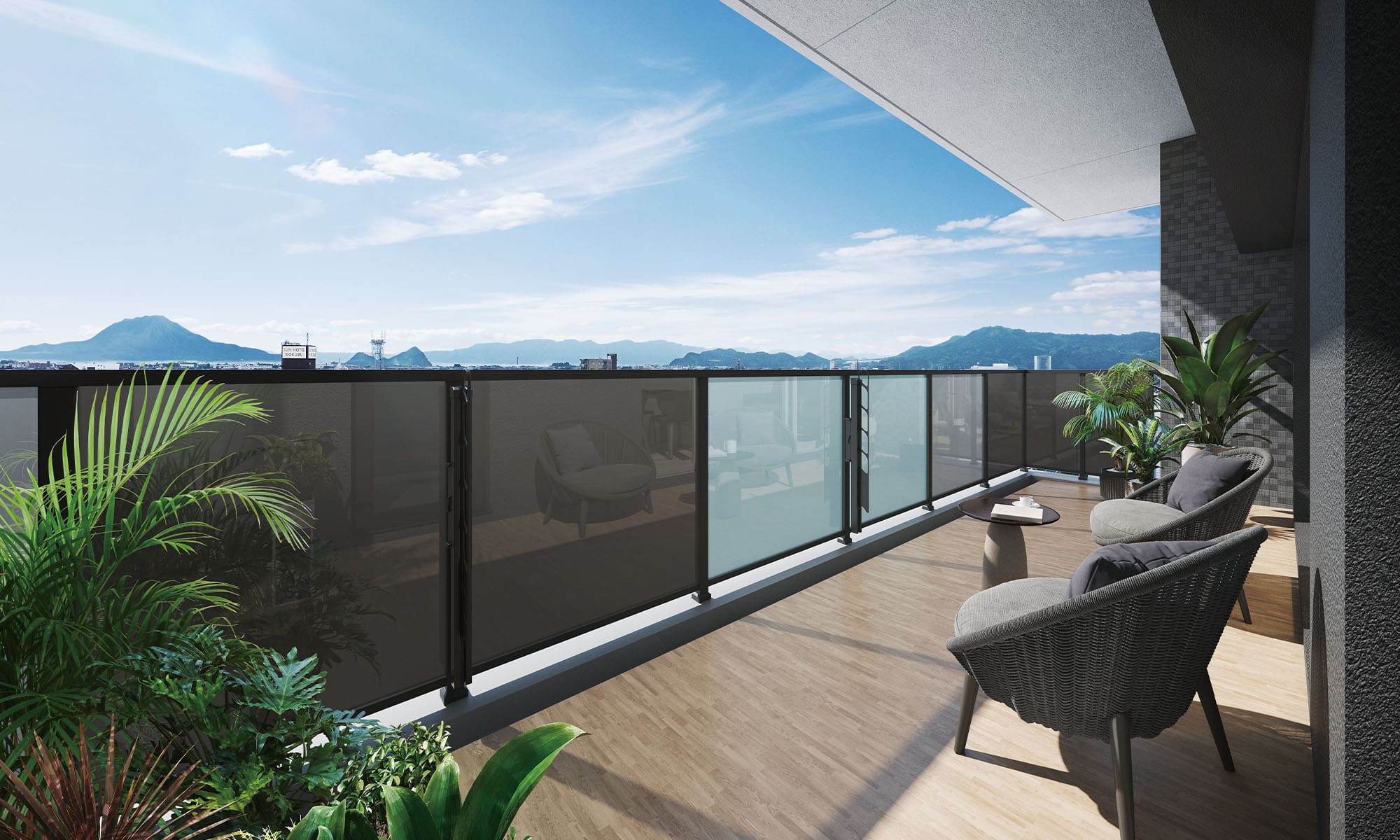 都心の中でも穏やかなエリアに誕生する12階建てのマンションは、光や風、爽快な眺めをもたらします。その恵みを活かすために、奥行き2.3mのワイドなバルコニーを全邸にプランニング。家具を置いて寛ぐのも、ガーデニングなど趣味空間として愉しむのも自由自在です。上層階からは錦江湾に浮かぶ勇壮な桜島を眺められ※、1日の始まりを心豊かに演出します。