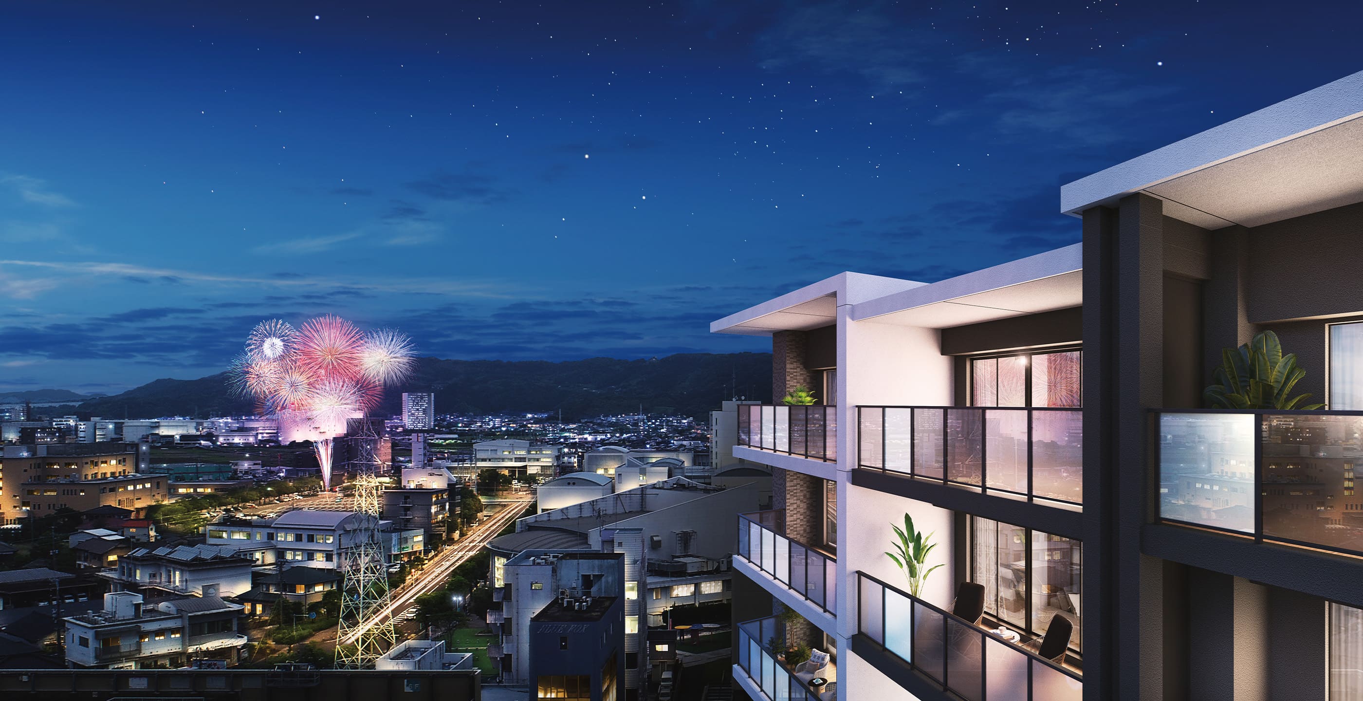 日中は、溢れる陽光や眺望を愉しみ、夏には特別な夜が訪れる「ブランシエラ国分中央」。霧島市役所から毎年恒例の花火が打ち上がり、夏の風物詩を満喫できます※。花火の音はもちろん振動までも伝わるような臨場感を、ビール片手に愉しむプレミアムな夜。日常を感動のシーンに変えるマンションライフは、ブランシエラの創造への想いから生まれたものです。