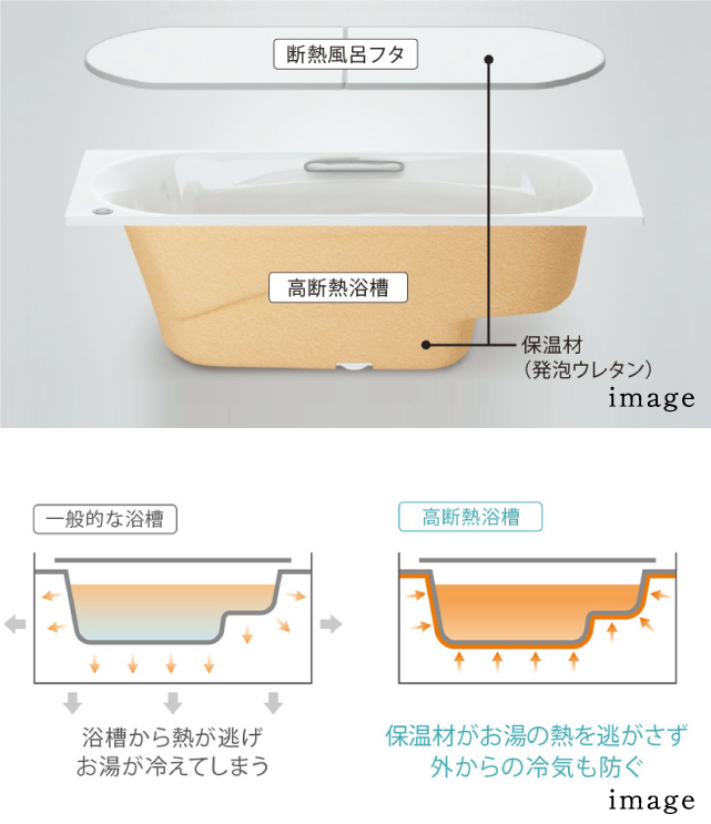 浴槽外側に保温材を吹き付けた高断熱浴槽と、保温材入りの断熱風呂フタをセットで使えば、あたたかさ長続き。追焚きの回数が減り、光熱費の節約にもなります。