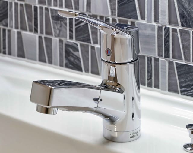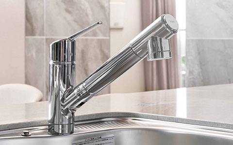 ヘッドを引き出して使える混合水栓。温度や水量は簡単に調節できます。