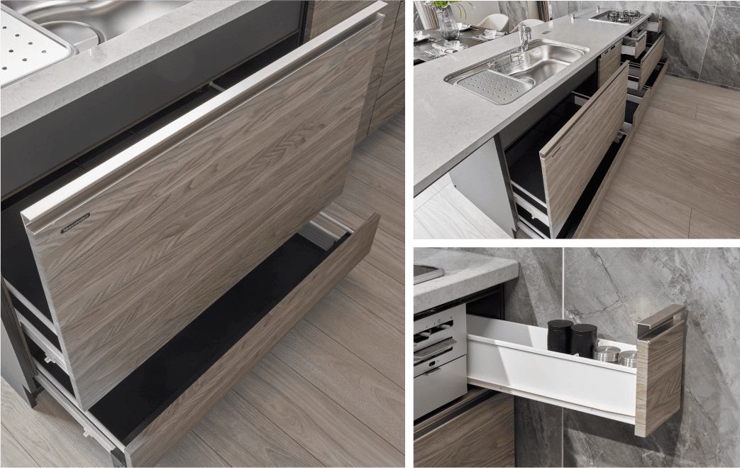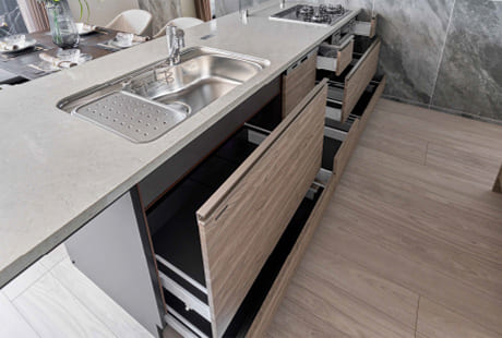 収納スペースの奥まで無駄なく使えるスライド収納を採用。重い物を入れてもスムーズに引き出せ、静かに閉じる「ソフトクローズ機能」を装備しています。