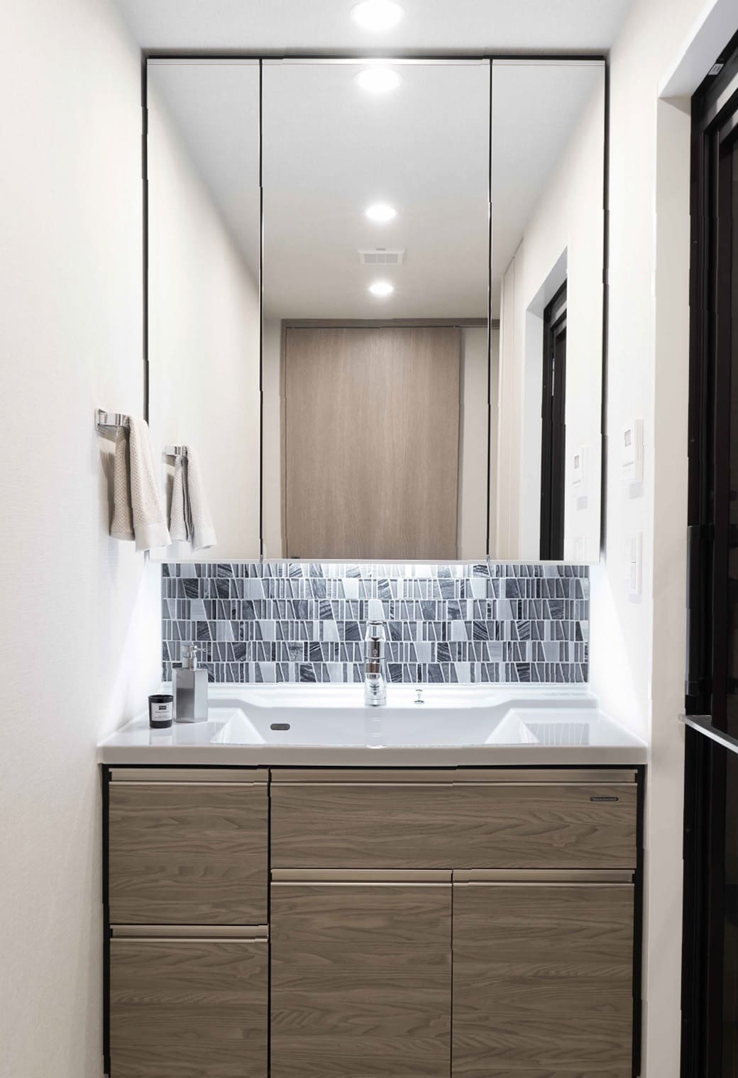 三面鏡の裏は全面収納に。化粧品や身だしなみ用品類を整理できるスペースを確保。洗面周りをすっきりと片付けられます。