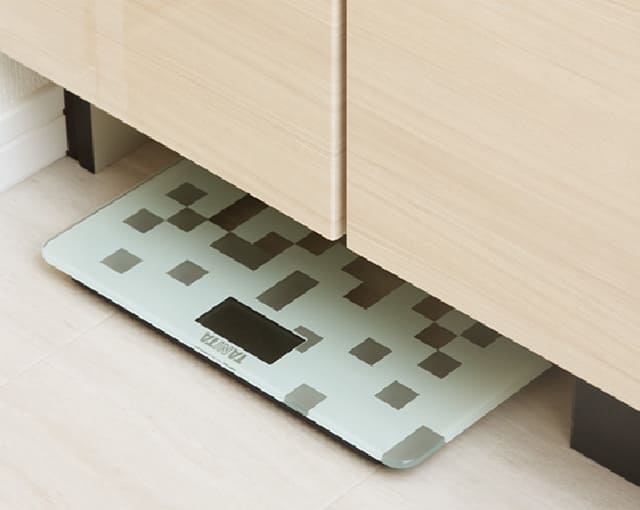 置き場所に困るヘルスメーターも巾木部分にすっきり収納。使う時だけサッと取り出せる便利なスペースです。