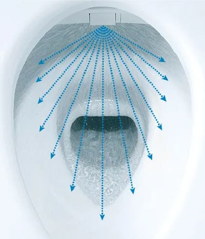 渦を巻くようなトルネード洗浄が、少ない水で効率的に洗浄します。汚物が付着しやすい便器後方に勢いよく当たるので、汚れをしっかり洗い流します。
