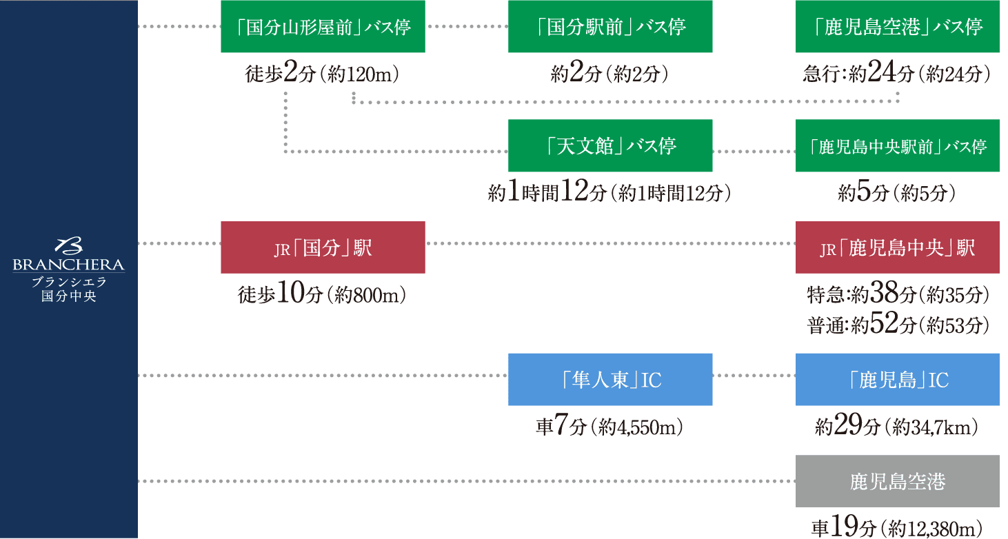 ※バス・JRの乗車所要時間は、「通勤時○○分(日中平常時○○分)」にて表示。乗換が必要な場合は乗換にかかる時間も含めたトータルの時間で表示。
