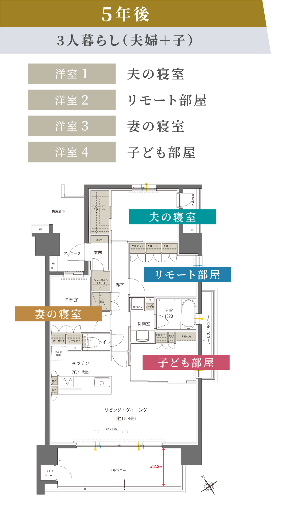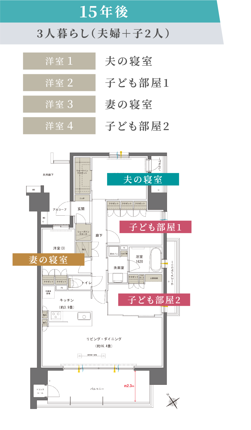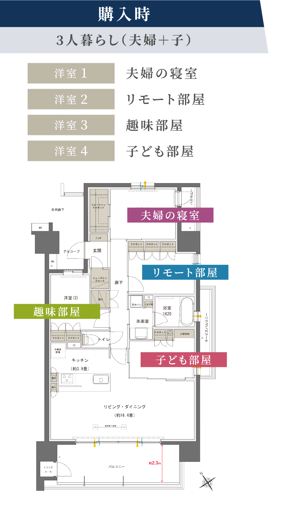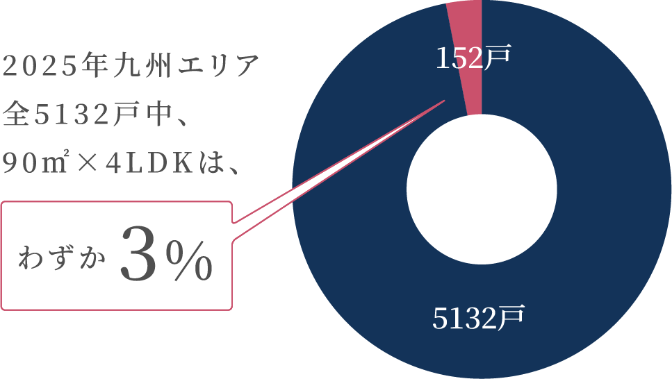新しい家族を迎える時、窮屈ではなく、広い空間でのびのびと育ってほしい。成長に合わせて、一人部屋も用意してあげたい。家族の団らんの心地よさと、自分の時間を大切にできるプライベート空間。どちらも大切にできる、ゆとりある広さが備わります。