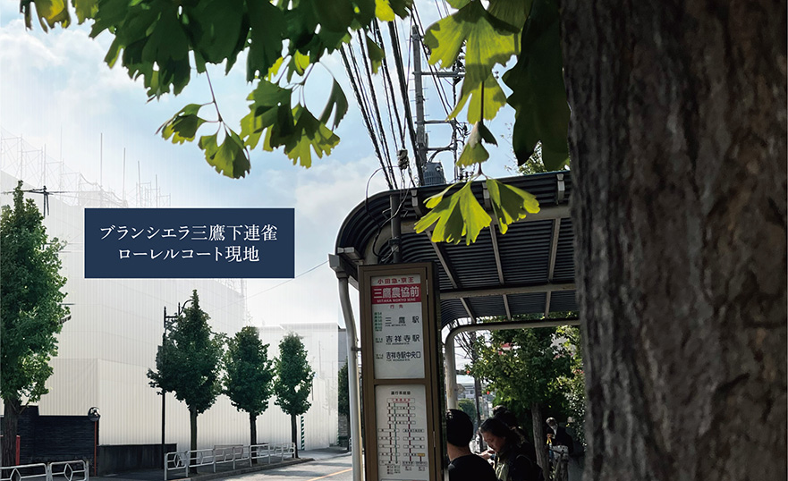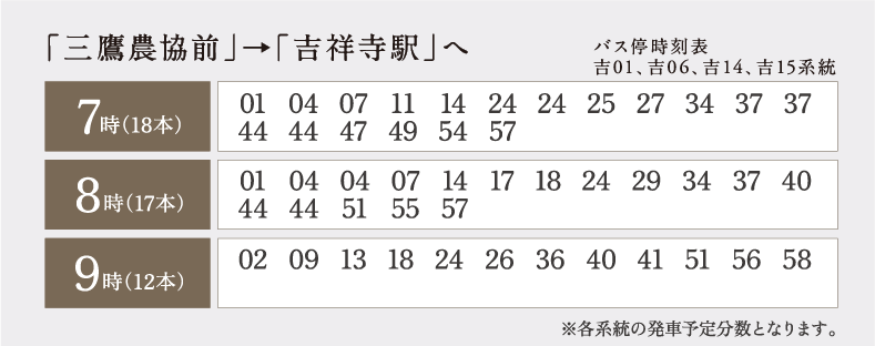 ※5.「吉祥寺」駅から「三鷹農協前」バス停留所までの通勤時所要時間となります。日中時も同様。「三鷹農協前」バス停留所から「吉祥寺」駅までの通勤時所要時間は約18分となります。日中時は約21分。