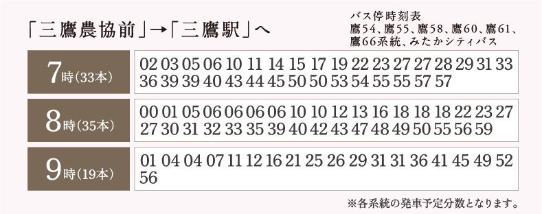 ※2.「三鷹農協前」2つの停留所(バス停マップ_A徒歩2分/D徒歩3分)における通勤時(7時〜9時台)の発車合算数となります。