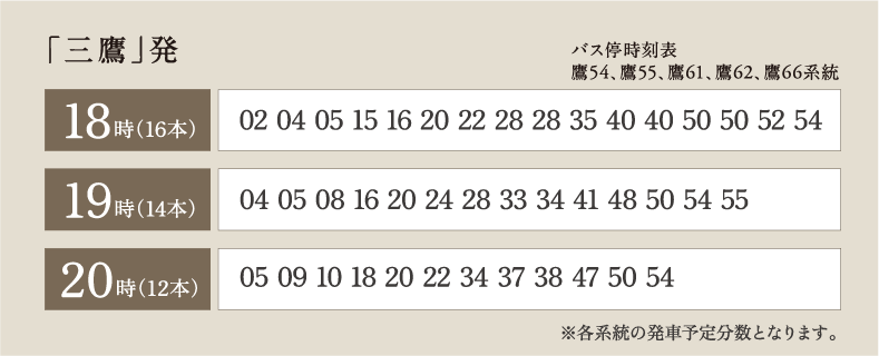 ※3.「三鷹」駅バス停留所(③⑦⑧⑨乗り場)と「吉祥寺」駅バス停留所(③④⑧乗り場)における帰宅時(18時〜20時台)の発車合算数となります。