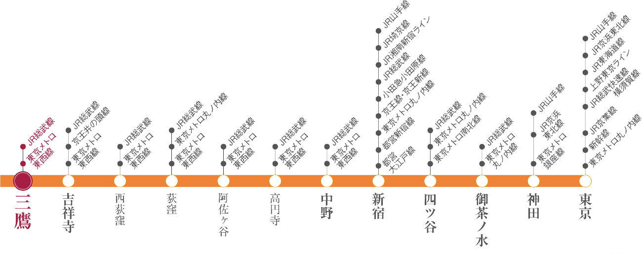 JR中央線・総武線・東京メトロ東西線直通「三鷹」駅より