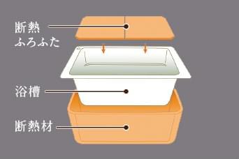 発泡ポリスチレン断熱材で断熱。5.5時間たっても温度低下は2.5℃以内。沸かし直しが減らせる浴槽です。