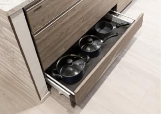 奥のものも取り出しやすいスライド収納は、勢いよく閉じても静かに閉まるソフトクローズ機能付です。(一部除く)