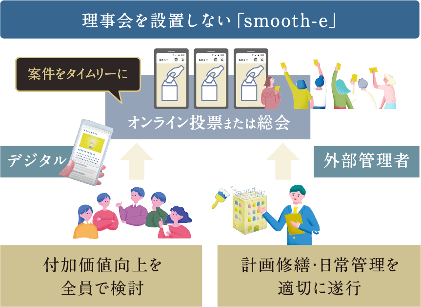 これまでの管理組合運営は、組合役員への負担の集中や意思決定の難しさが課題とされてきました。smooth-eは、そうした課題を解決するため、日常管理や煩雑な業務は専門家に任せ、パソコンやスマートフォンを使って組合員全員が気軽にマンション管理に関わることのできるマンション管理サービスです。
