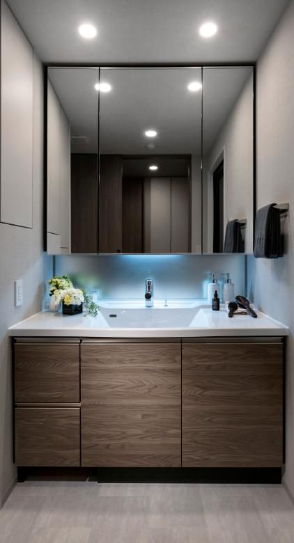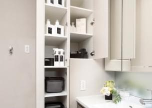 お風呂上りに取り出しやすいバスタオルや洗濯用品などが入れられる棚付き収納。空間をすっきりと演出します。