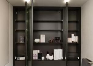 化粧品や身支度のための小物を全面収納。ミラーを内側に向けることで後ろを見る姿見としても使用できます。
