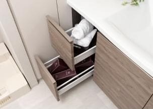 置き場所に困りがちなヘルスメーターを、洗面化粧台の足元にすっきりと収納できます。