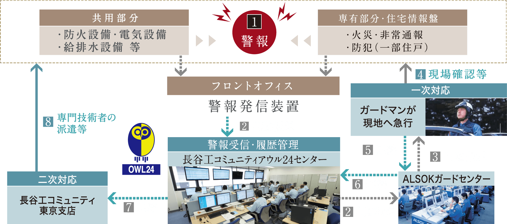 住戸内・共用部の異常を感知した際、長谷工コミュニティの「アウル24センター」に自動通報。状況に応じて警備会社など関係各所への通報を行い、管理会社からスタッフが駆けつけるなど24時間365日体制で暮らしを見守ります。