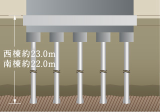 敷地の支持地盤は、地表面から約21m以深の砂礫層に対し「場所打ちコンクリート杭アースドリル工法(一部アースドリル拡底工法)」により支持杭を合計29本打込んでいます。