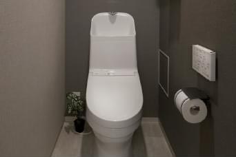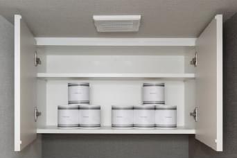 トイレットペーパーのストックやタオル・芳香剤などサニタリー用品の収納に便利な吊戸棚を設置しています。